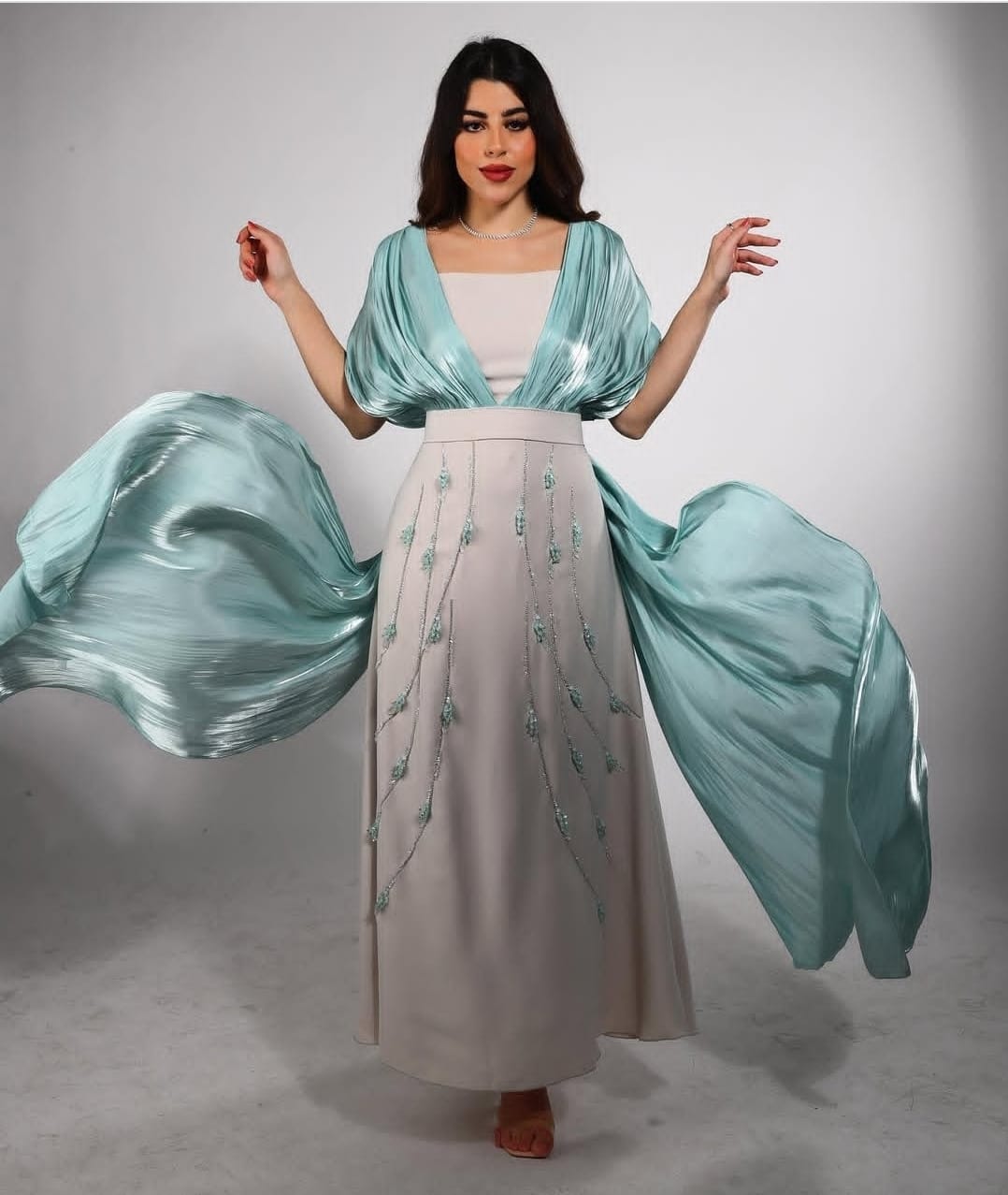 An elegant flowy gown in soft beige with a shimmering aqua drape, symbolizing grace and luxury. The metallic silk overlay adds a dramatic flair, while the delicate bead detailing on the skirt enhances its sophistication — perfect for formal evenings or special events.