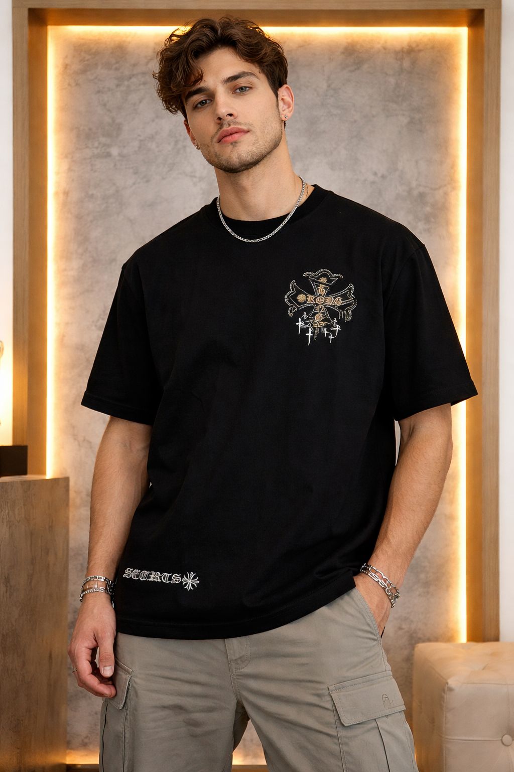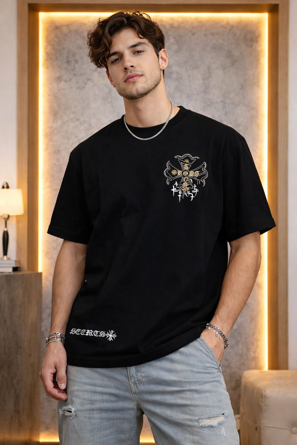 The Midnight Gothic Embroidered Black T-Shirt is designed for those who appreciate a minimalist look with a touch of luxury. Made from soft, breathable cotton, it ensures all-day comfort, while the detailed gothic embroidery on the chest adds a bold, premium accent. Its slim yet relaxed fit makes it perfect for both casual and streetwear styles. Effortlessly pairs with jeans, cargos, or layered outfits — a timeless black tee and a must-have for every wardrobe.