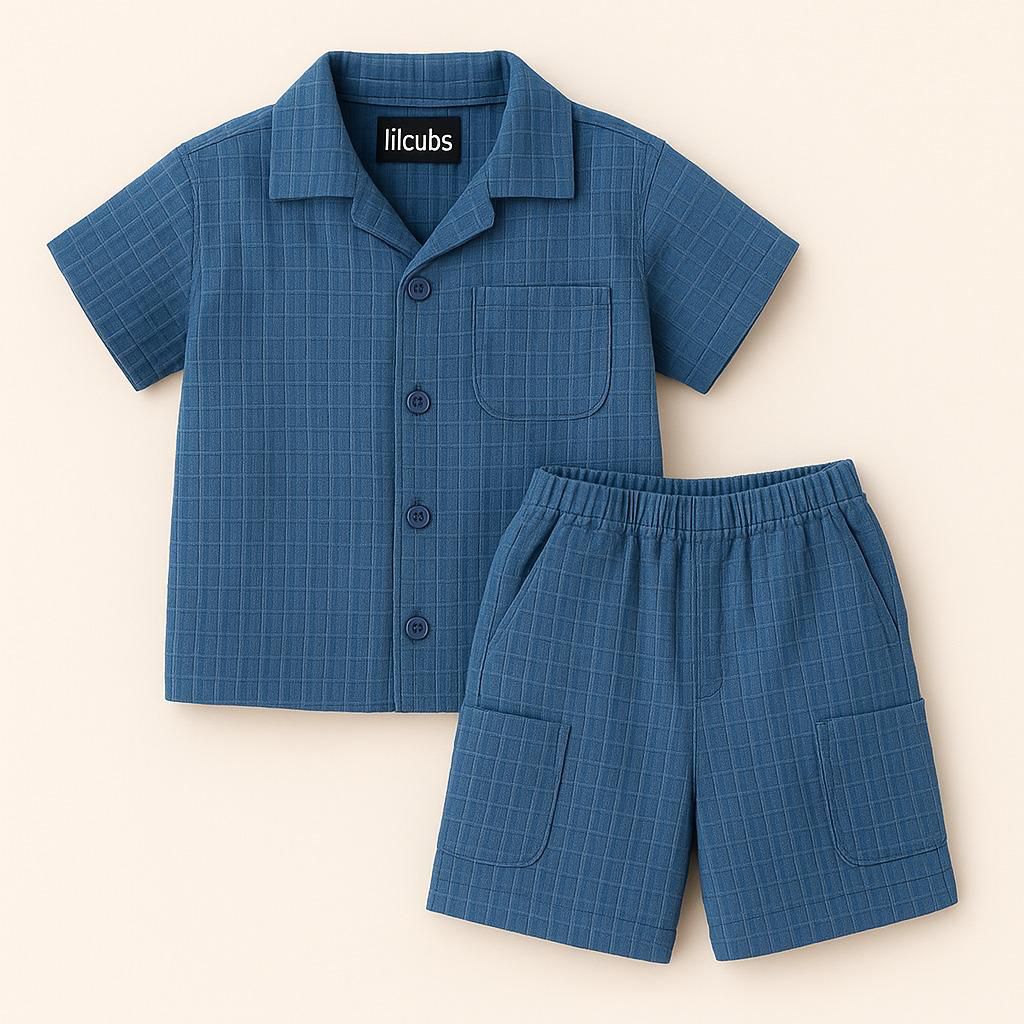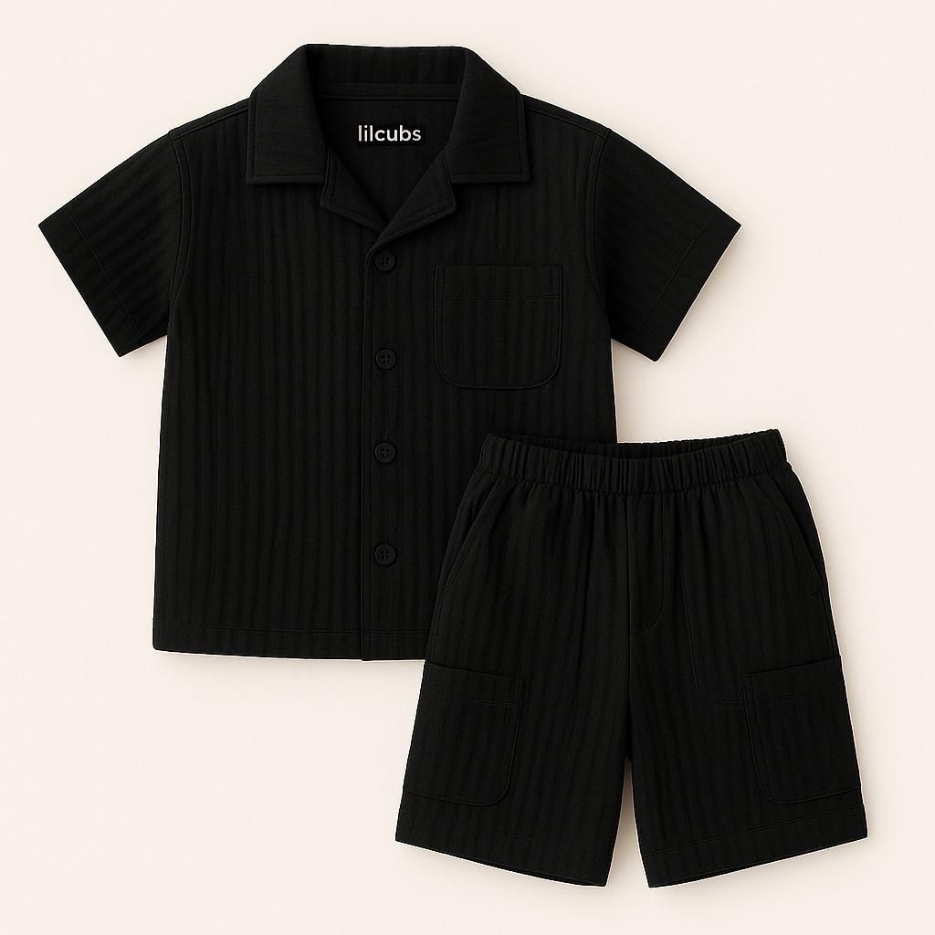 Dress your little one in comfort and style with this Olive Green Textured Kids Summer Set. Made from soft, breathable fabric, this two-piece outfit includes a short-sleeve button-down shirt and matching elastic-waist shorts. The elegant textured pattern adds a premium look, while the relaxed fit ensures all-day comfort. Featuring a rich olive green color, functional pockets, and lightweight material, this set is ideal for summer outings, casual wear, and everyday play